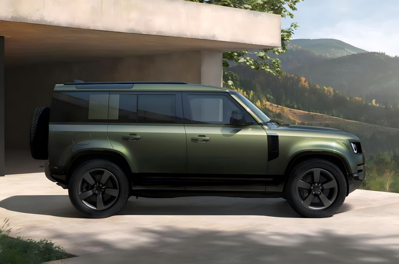 Lato. Vista laterale, il nuovo veicolo continua lo stile classico del Land Rover Defender. La versione 110 adotta un design a quattro porte, caratterizzato da ampi parafanghi laterali anteriori e posteriori, insieme a ruote a cinque razze e pinze freno a più pistoncini. Le dimensioni della carrozzeria rimangono invariate, con lunghezza, larghezza e altezza rispettivamente di 5018/2105/1967 mm e un passo di 3022 mm.